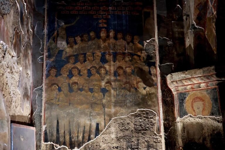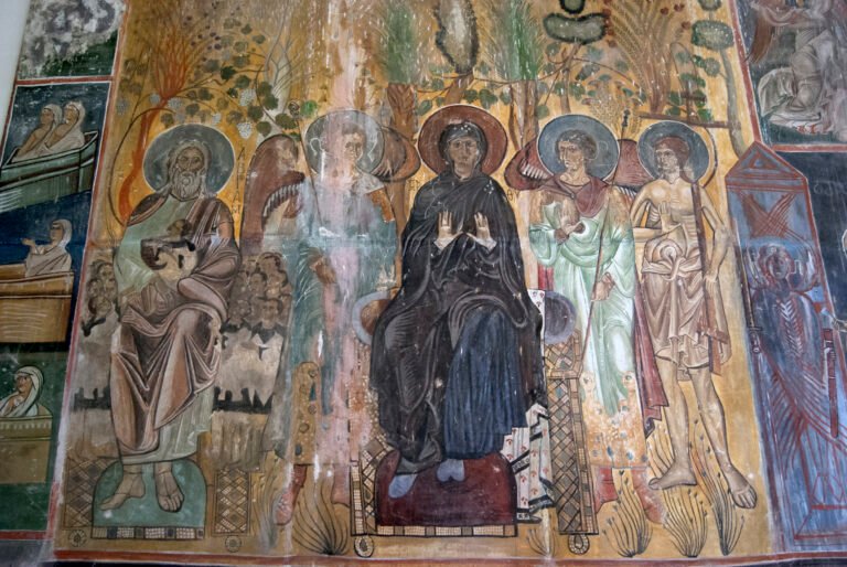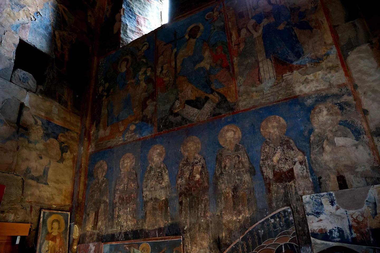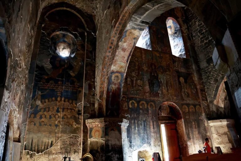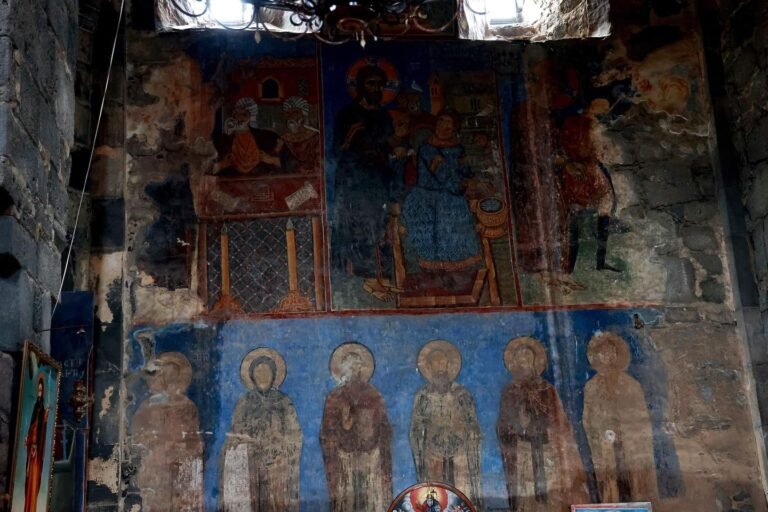 Inside, the church is remarkable for its extensive fresco program, unparalleled in Armenia. Highlights include the Mother of God enthroned on the altar wall, the Holy Communion, the image of John the Baptist (Hovhannes Karapet) on the north wall, and a dramatic Last Judgment scene on the west wall. Rows of saints beneath arches and on pediments enrich the interior, making these frescoes some of the most important examples of Christian art beyond Byzantium. The prayer hall, notable for its three entrances, features finely carved parapets, and the church underwent restoration in the 1970s, with further conservation and cleaning in recent decades.